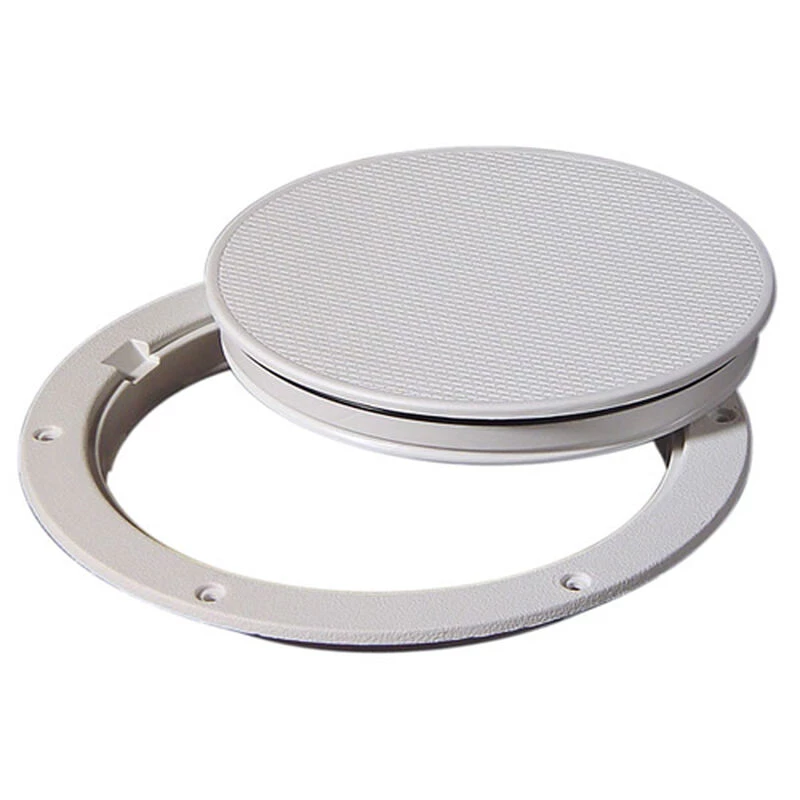 Watertight deck plate with secure snap-fit closure and o-ring seal. Flange has beveled edge, pry out notch and six countersunk fastener holes. Structural material stands up to tough service, extreme weather and solvents. Requires six #8 pan-head screws, not provided.
